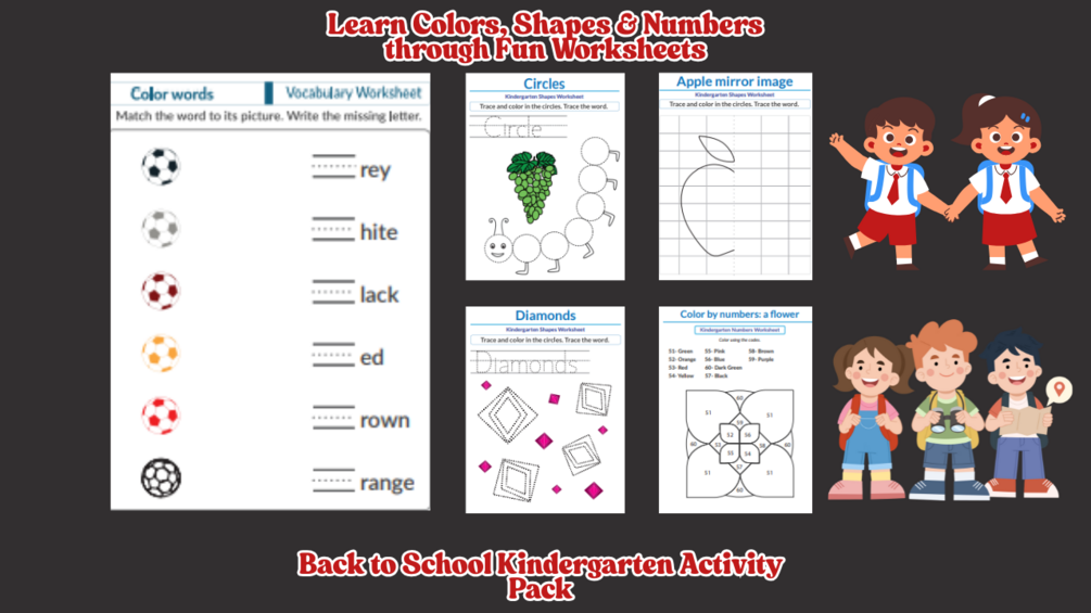 Back to School Kindergarten Activity Pack – Learn Colors, Shapes & Numbers through Fun Worksheets